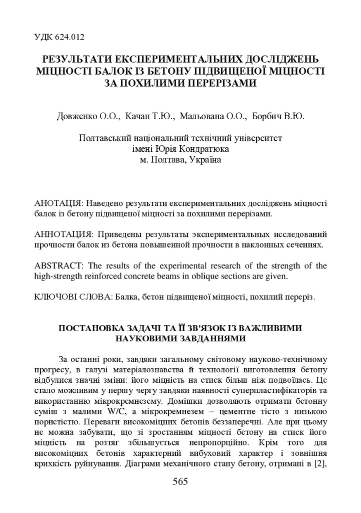 2020/06/05Результати експериментальних досліджень міцності балок із високоміцного бетону за похилими перерізами