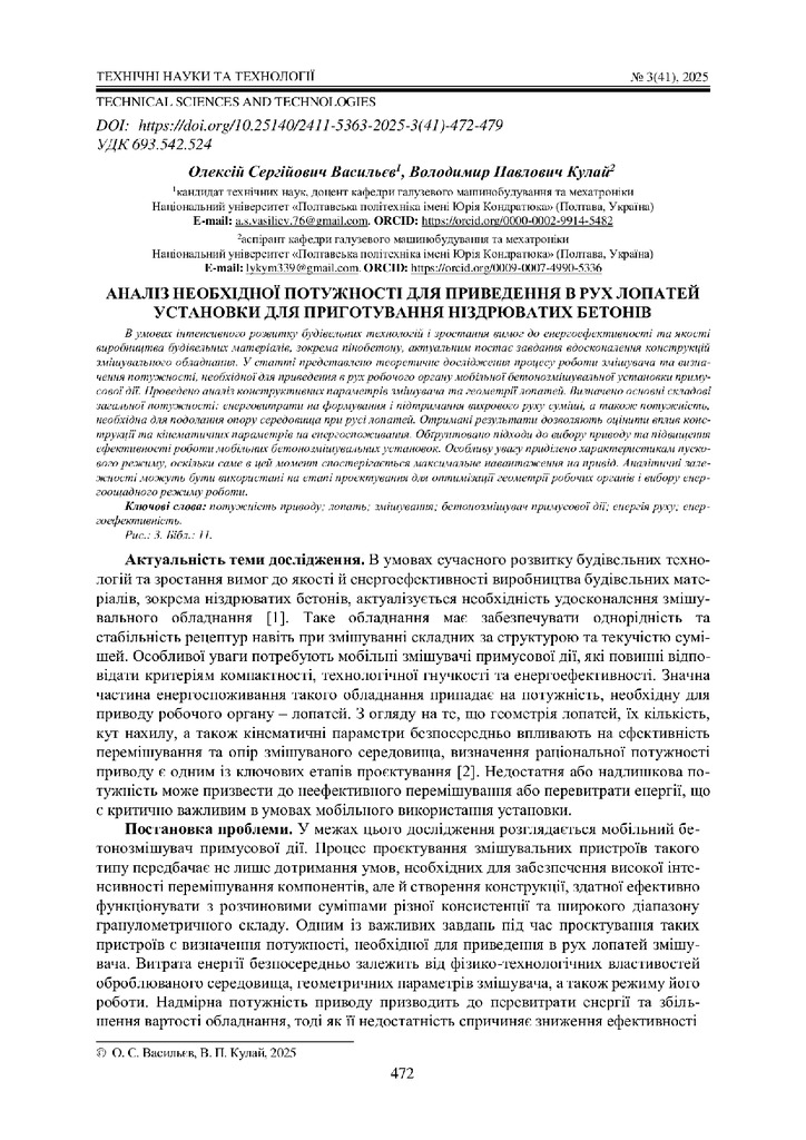 Стаття 2025/12/05Аналіз необхідної потужності для приведення в рух лопатей установки для приготування ніздрюватих бетонів