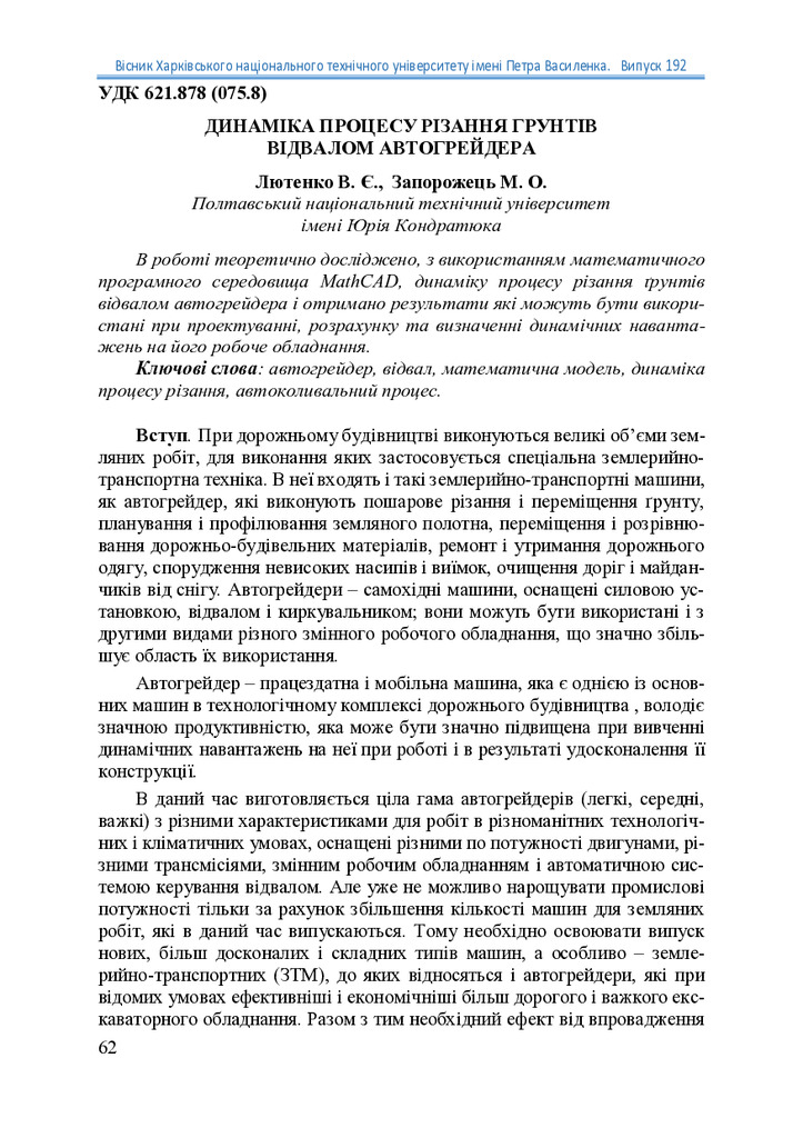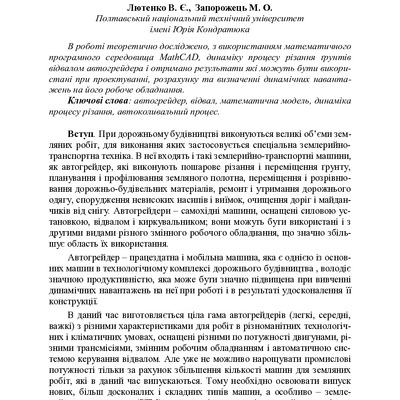 Стаття 2020/07/06Динаміка процесу різання грунтів відвалом автогрейдера