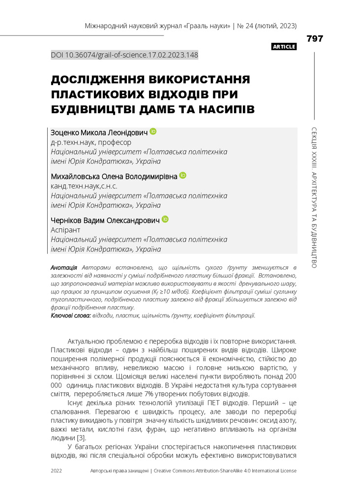 Стаття 2023/06/09Дослідження використання пластикових відходів при будівництві дамб та насипів