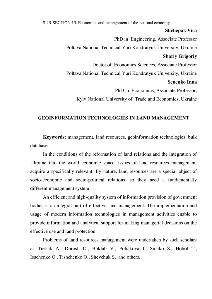 In the conditions of the reformation of land relations and the integration of Ukraine into the world economic space, issues of land resources management acquire a specifically relevant. By nature, ...