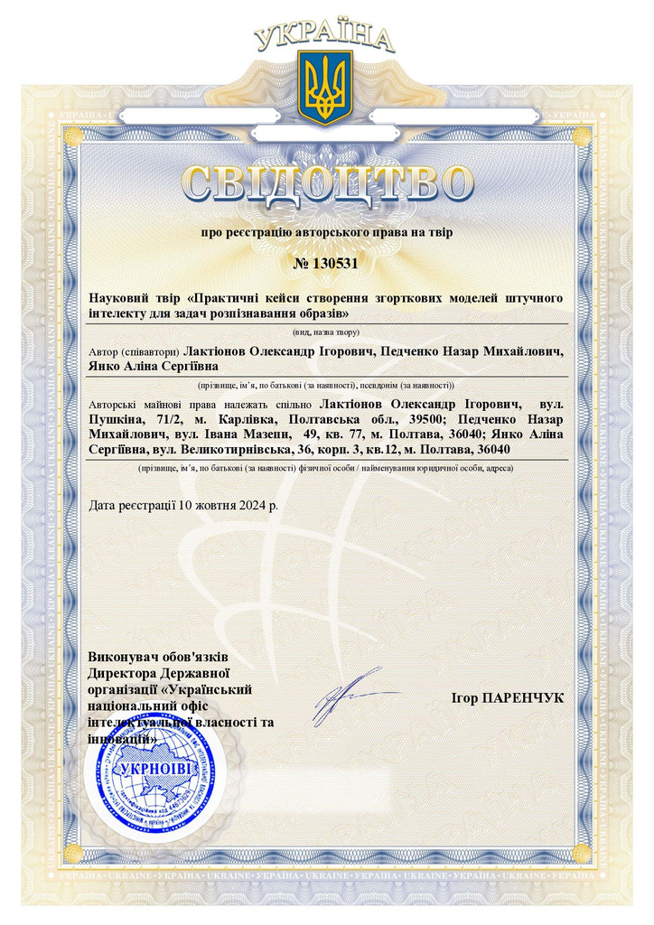 Стаття 2025/03/11Свідоцтво про реєстрацію авторського права № 130531 на твір «Практичні кейси створення згорткових моделей штучного інтелекту для задач розпізнавання образів»
