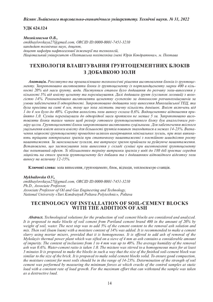 Стаття 2023/02/09Технологія влаштування ґрунтоцементних блоків з добавкою золи