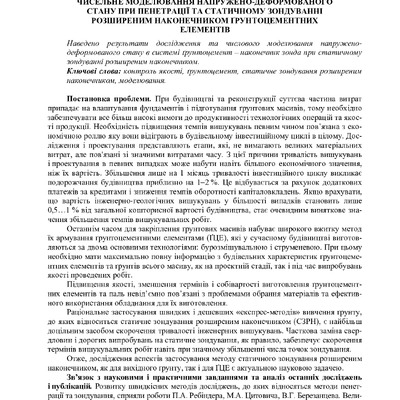 Стаття 2020/06/30Чисельне моделювання напружено-деформованого стану при пенетрації та статичному зондуванні розширеним наконечником ґрунтоцементних елементів