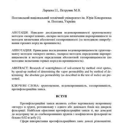 Наведено дослідження водонепроникності ґрунтоцементу методом визначення абсолютної газопроникност...