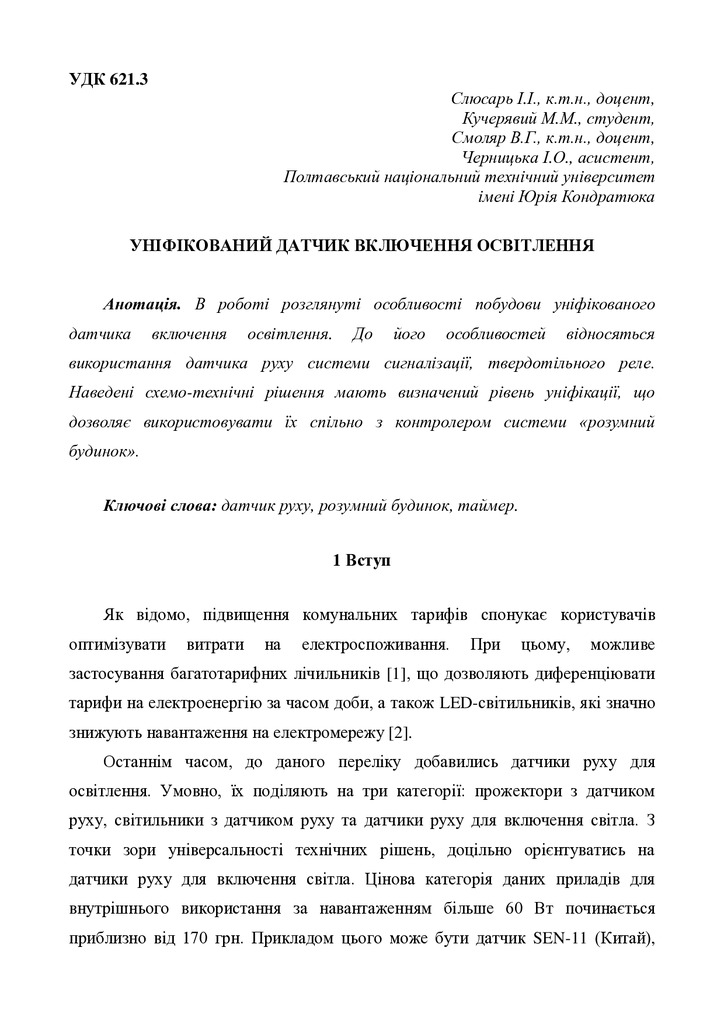 В роботі розглянуті особливості побудови уніфікованого датчика включення освітлення. До його особливостей відносяться використання датчика руху системи сигналізації, твердотільного реле. Наведені с...