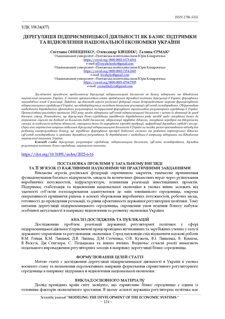 Дерегуляція підприємницької діяльності як базис підтримки та відновлення національної економіки України