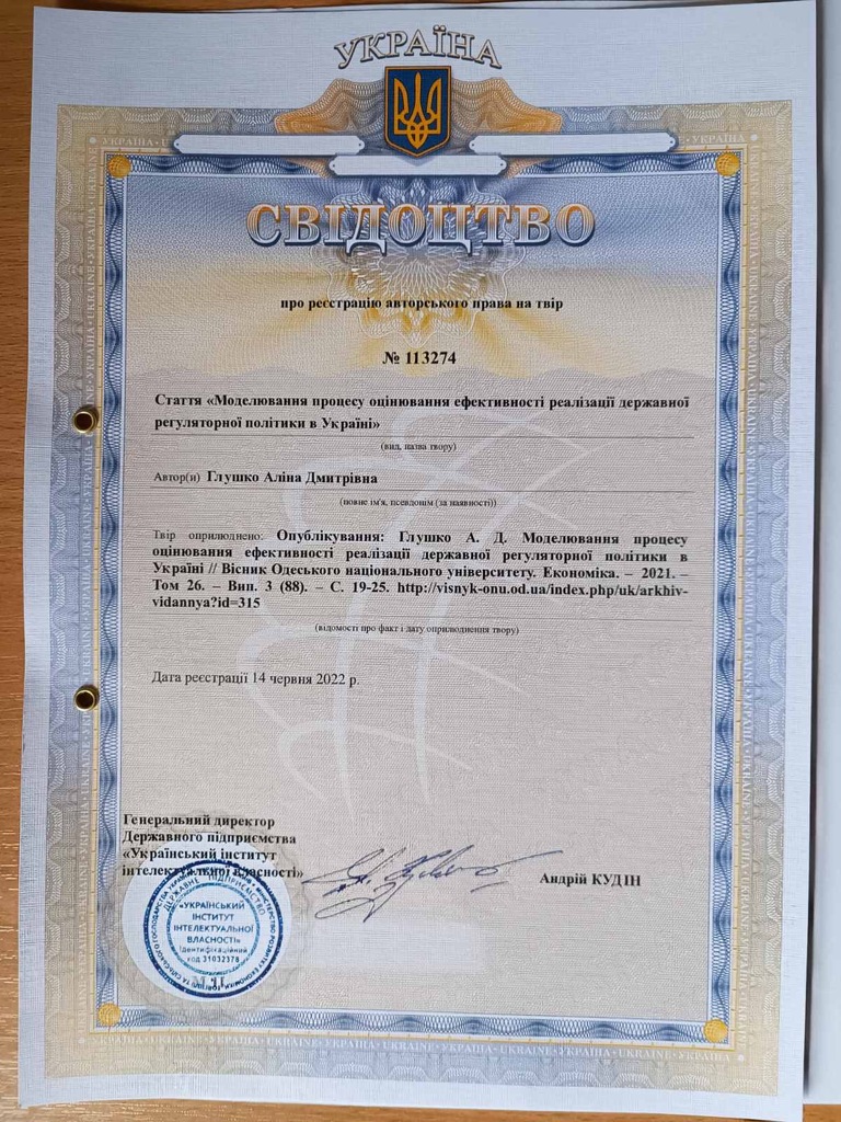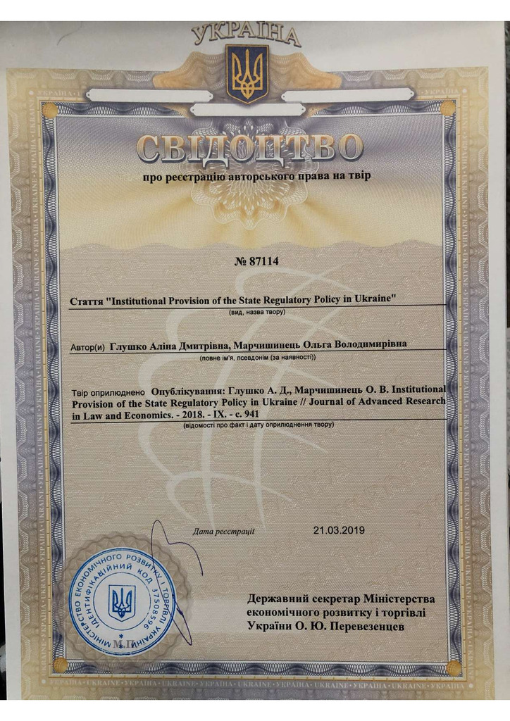 Стаття 2023/01/20Свідоцтво про реєстрацію авторського права 87114 на твір "Institutional provision of the state regulatory policy in Ukraine"