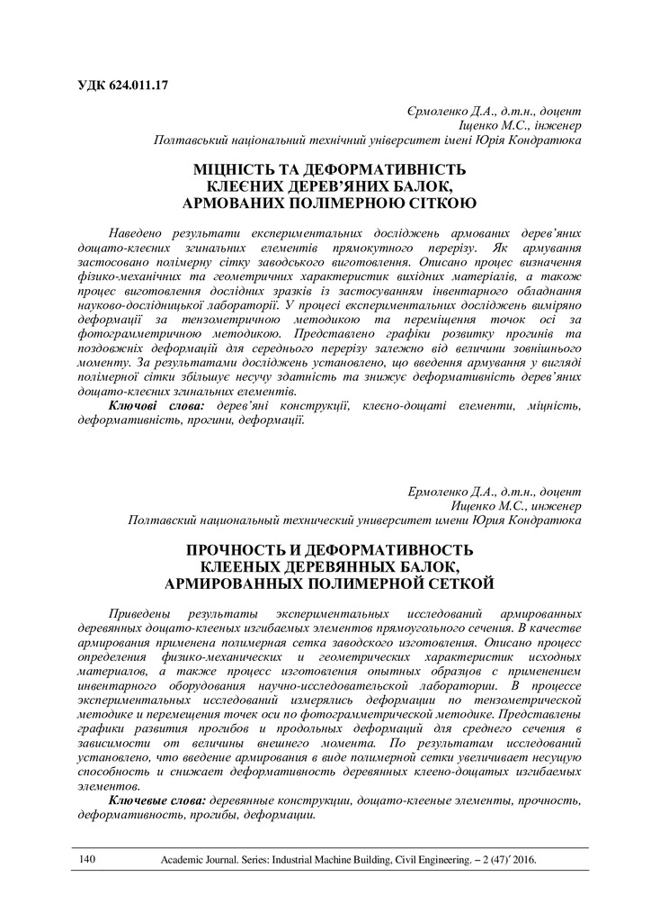 2018/02/26Міцність та деформативність клеєних дерев’яних балок, армованих полімерною сіткою