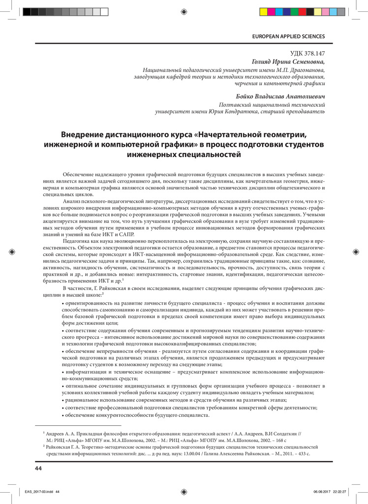 Внедрение дистанционного курса «Начертательной геометрии, инженерной и компьютерной графики» в процесс подготовки студентов инженерных специальностей