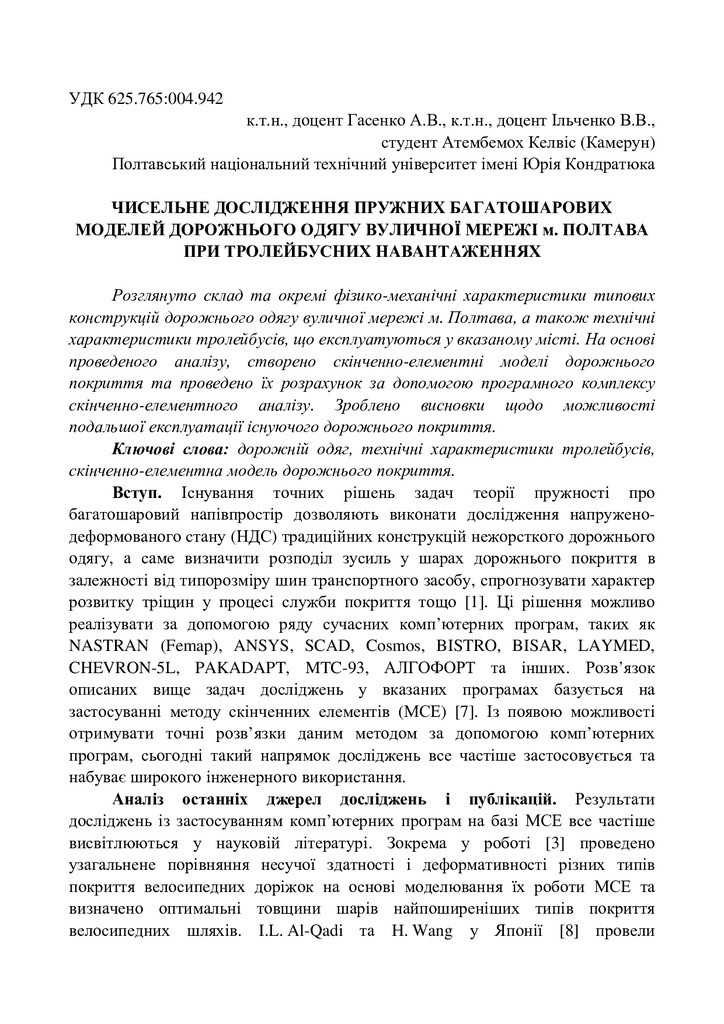 2019/02/10Чисельне дослідження пружних багатошарових моделей дорожнього одягу вуличної мережі м. Полтава при тролейбусних навантаженнях