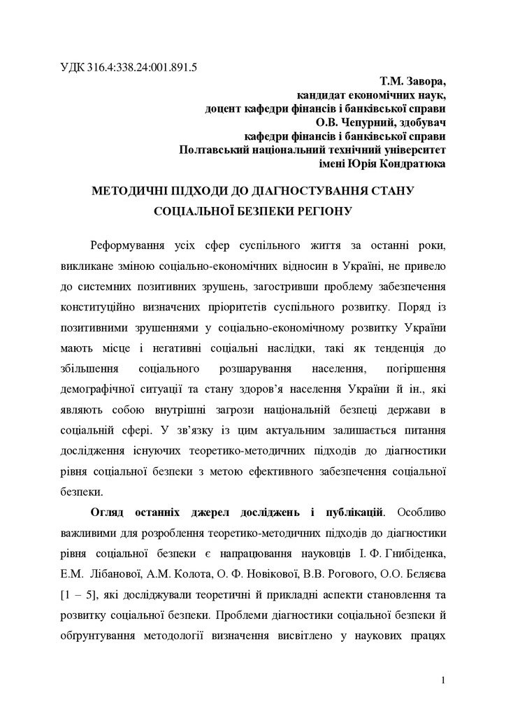 Методичні підходи до діагностування стану соціальної безпеки регіону