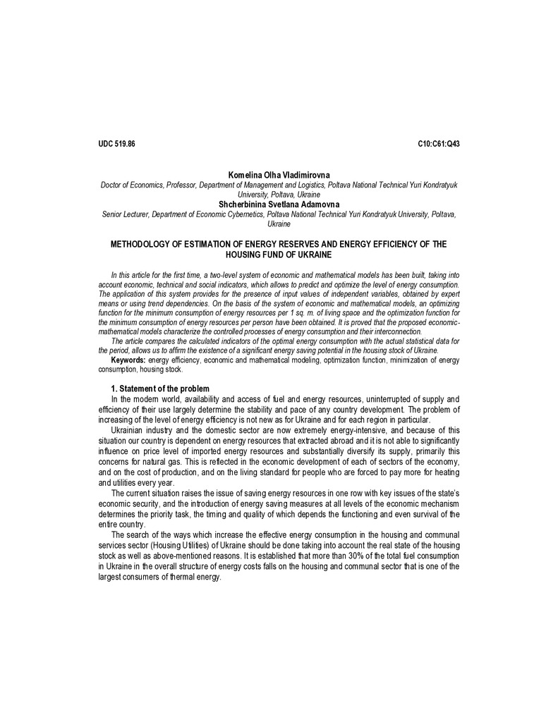 It was developed two-level system of economic and mathematical models to build the optimization function of the minimum energy consumption per 1 sq. m. of residential space on the basis of economic...