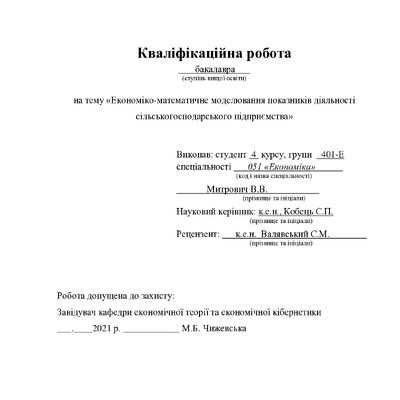Економіко-математичне моделювання показників діяльності сільськогосподарського підприємства
