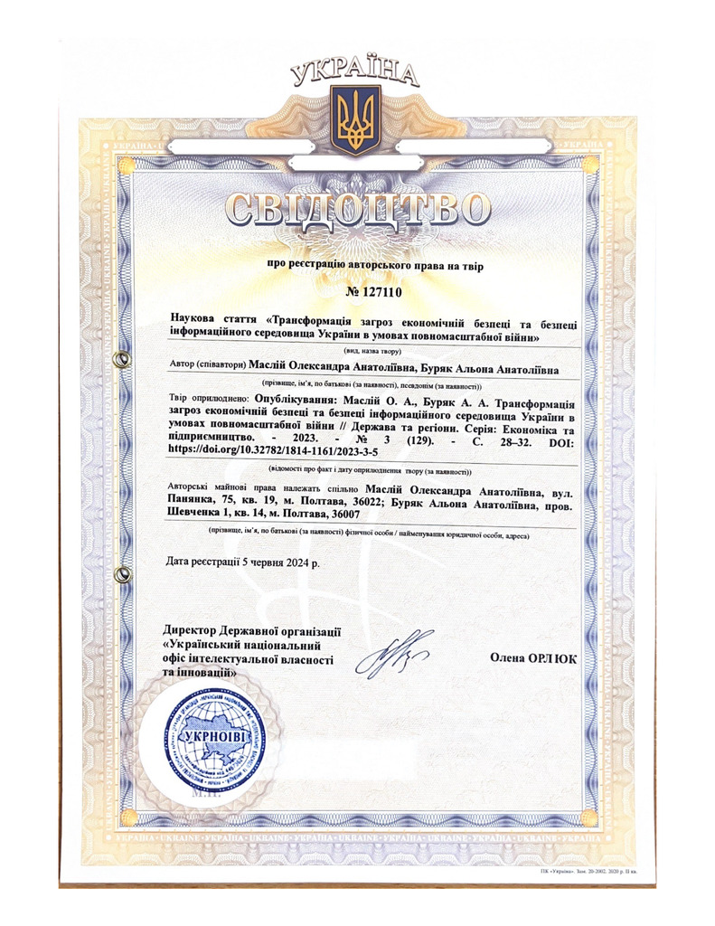 Свідоцтво про реєстрацію авторського права № 127110 на твір «Трансформація загроз економічній безпеці та безпеці інформаційного середовища України в умовах повномасштабної війни»