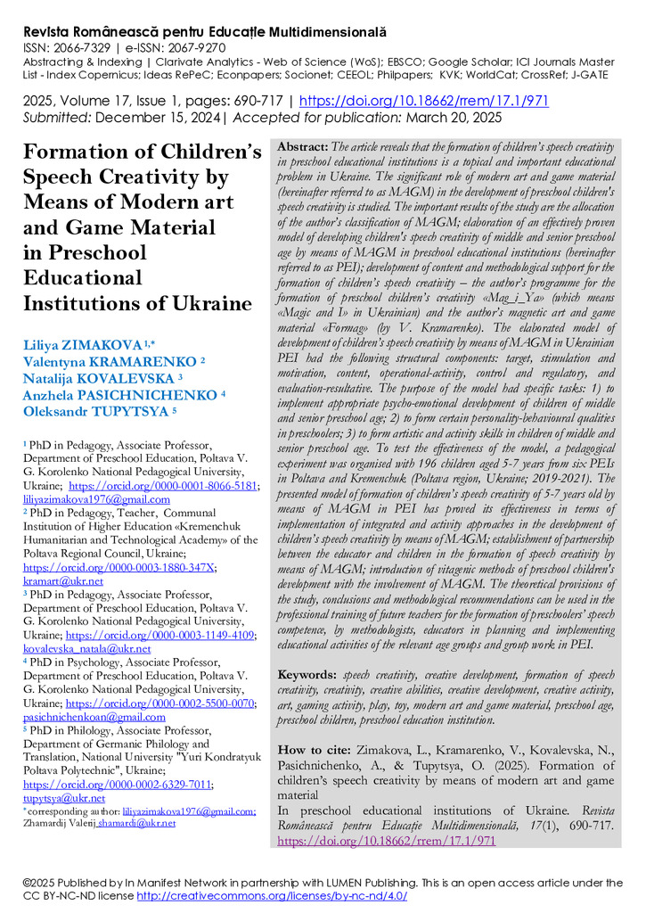 Formation of Children’s Speech Creativity by Means of Modern art and Game Material in Preschool Educational Institutions of Ukraine