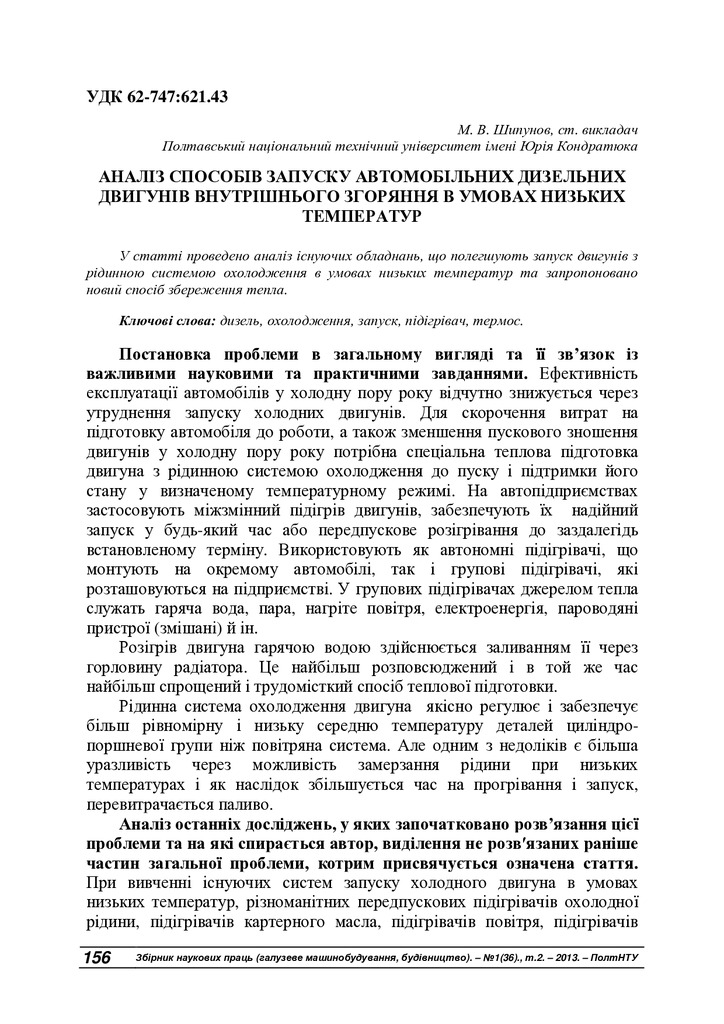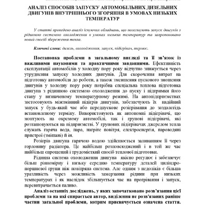 Аналіз способів запуску автомобільних дизельних двигунів внутрішнього згоряння в умовах низьких температур
