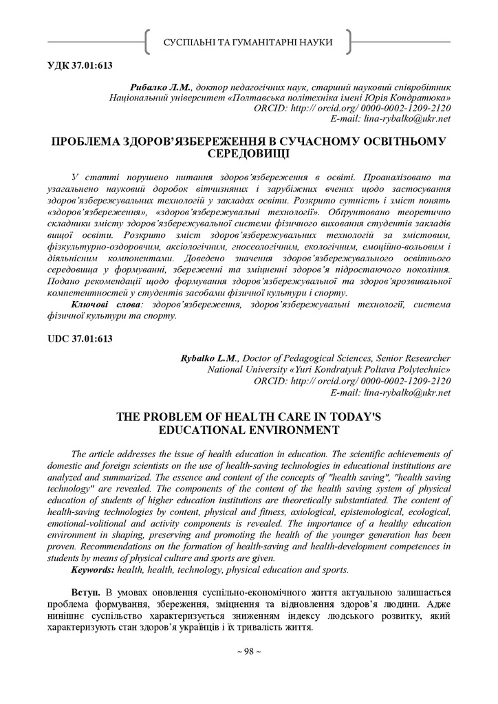 Стаття 2020/04/07Проблема здоров’язбереження в сучасному освітньому середовищі