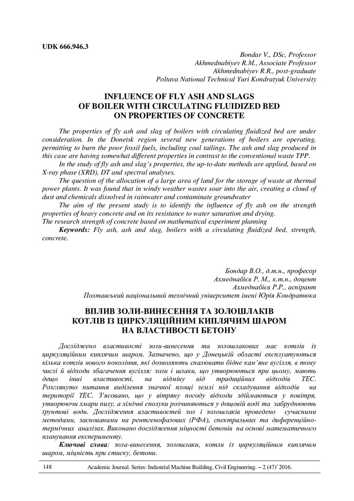 Стаття 2024/11/01Influence of fly ash and slags of boiler with circulating fluidized bed on properties of concrete