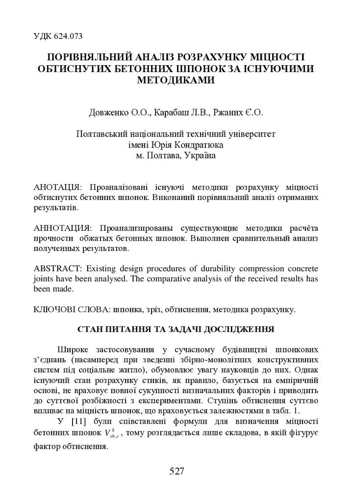 Проаналiзованi існуючі методики розрахунку міцності обтиснутих бетонних шпонок. Виконаний порівняльний аналіз отриманих результатів.