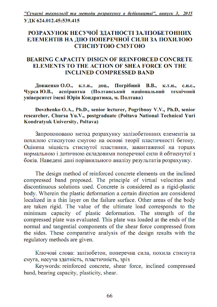 2023/06/21Порiвняльний аналiз розрахунку мiцностi залізобетонних шпонок за існуючими методиками (на прикладі контактного шва)