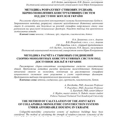 2018/09/19Методика розрахунку стикових з'єднань збірно-монолітних конструктивних систем під доступне житло в Україні