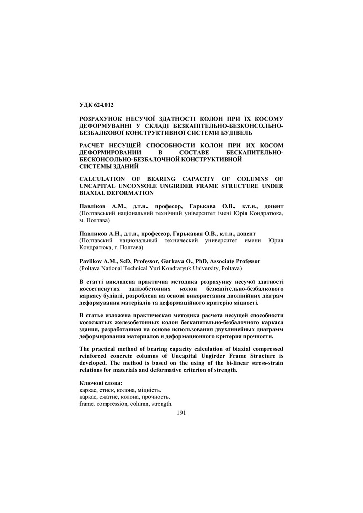 Стаття 2018/04/10Розрахунок несучої здатності колон при їх косому деформуванні у складі безкапітельно-безконсольно-безбалкової конструктивної системи будівель