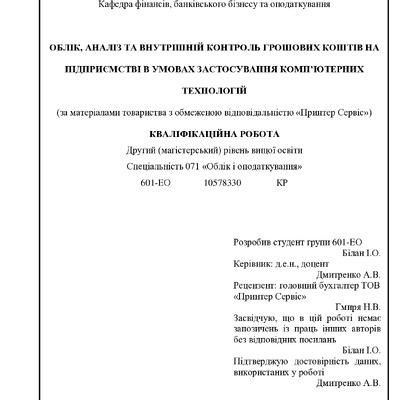 Облік, аналіз та внутрішній контроль грошових коштів на підприємстві в умовах застосування комп’ютерних технологій (за матеріалами товариства з обмеженою відповідальністю «Принтер Сервіс»)