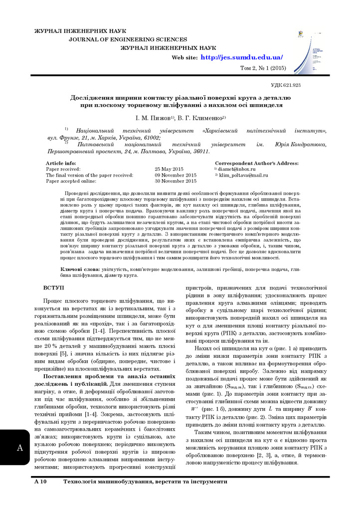 Стаття 2018/12/11Дослідження ширини контакту різальної поверхні круга з деталлю при плоскому торцевому шліфуванні з нахилом осі шпинделя