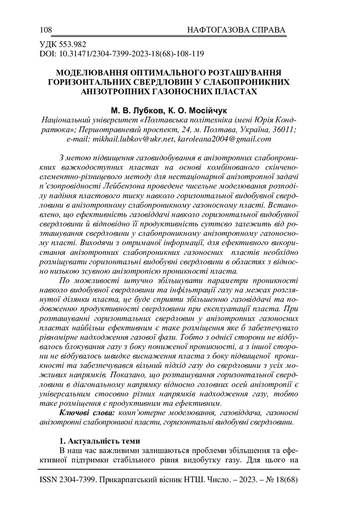 Стаття 2024/09/03Моделювання оптимального розташування горизонтальних свердловин у слабопроникних анізотропних газоносних пластах