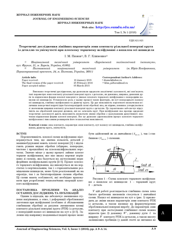 Виконано теоретичні дослідження, що дозволили одержати аналітичні залежності, які пов’язують такі параметри зони контакту різальної поверхні круга з деталлю, як довжина, ширина, довжини ду- ги та в...