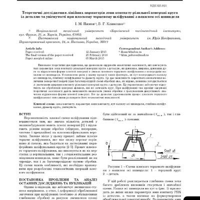 Теоретичні дослідження лінійних параметрів зони контакту різальної поверхні круга із деталлю та увігнутості при плоскому торцевому шліфуванні з нахилом осі шпинделя
