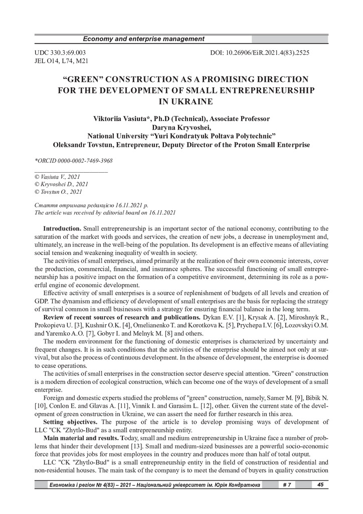 “Green” construction as a promising direction for the development of small entrepreneurship in Ukraine
