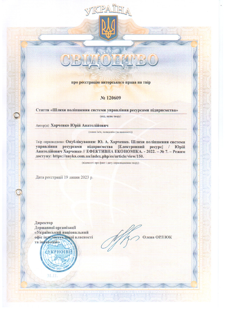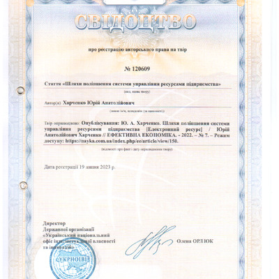 Стаття 2024/04/27Свідоцтво про реєстрацію авторського права № 120609 на твір "Шляхи поліпшення системи управління ресурсами підприємства"