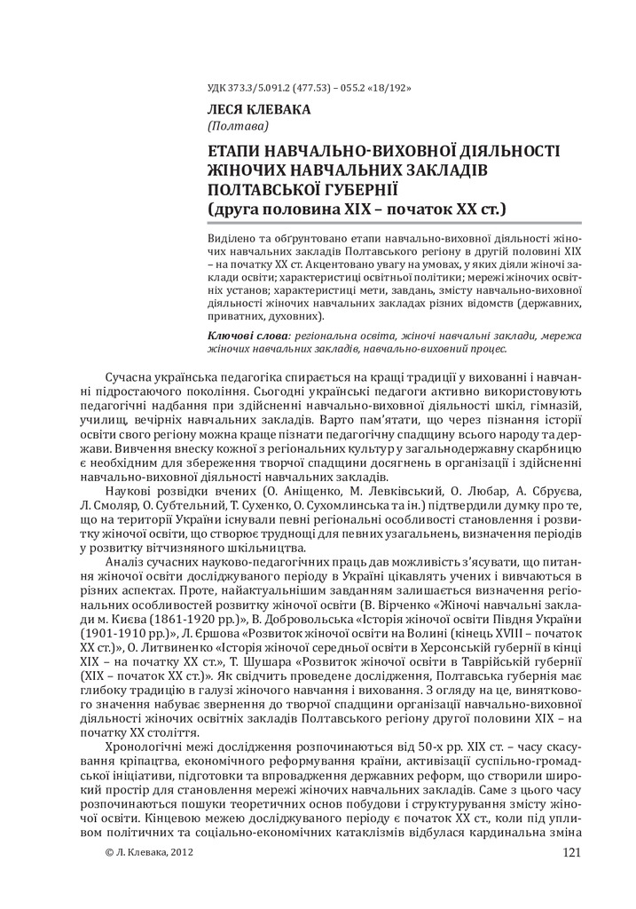 Виділено та обґрунтовано етапи навчально-виховної діяльності жіночих навчальних закладів Полтавсь...