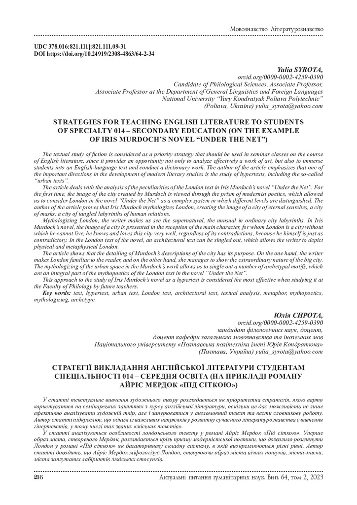 Стаття 2024/10/09Strategies for teaching English literature to students of specialty 014-secondary education (on the example of Iris Murdoch’s novel “Under the net”)