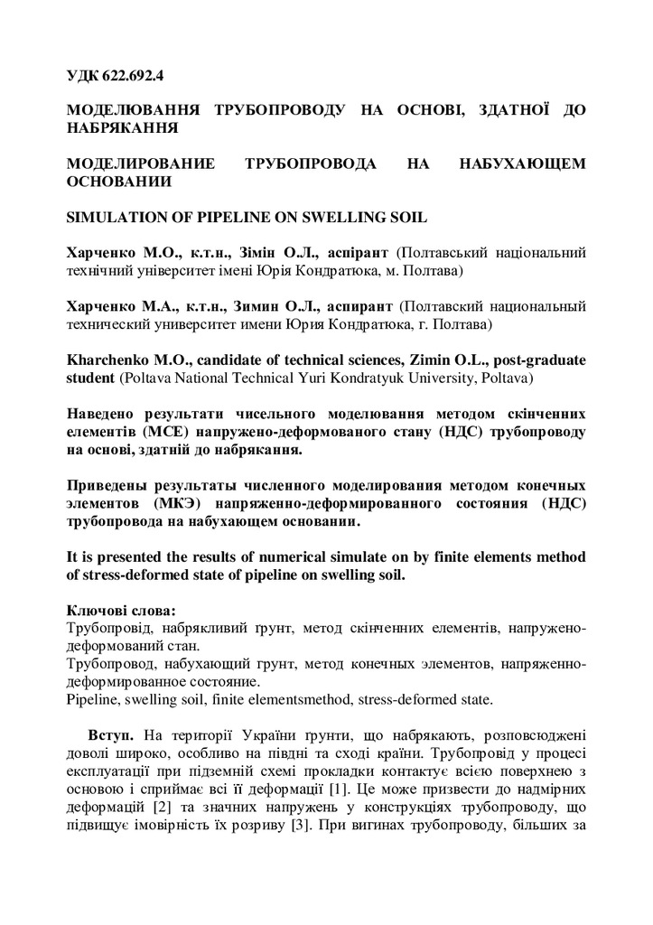 Наведено результати чисельного моделювання методом скінченних елементів (МСЕ) напружено-деформованого стану (НДС) трубопроводу на основі, здатній до набрякання.