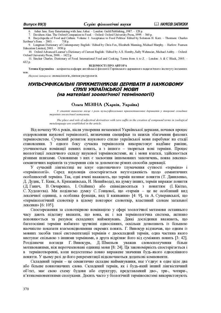 Стаття 2020/06/02Нульсуфіксальні прикметникові деривати в науковому стилі української мови (на матеріалі зоологічної термінології)