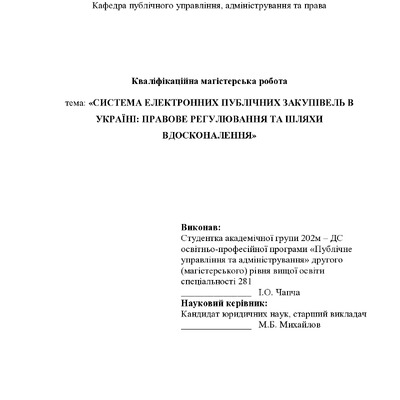 У роботі визначено зміст і сутність системи електронних публічних закупівель в Україні; охарактеризовано нормативно-правове забезпечення розвитку електронних публічних закупівель в державному уп...