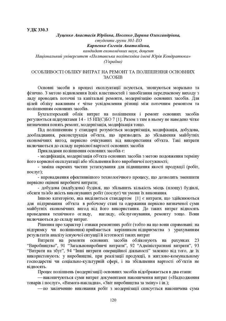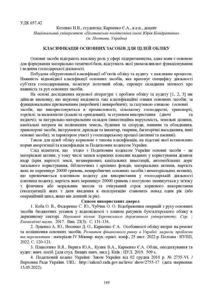 Стаття 2024/02/05Облік основних засобів бюджетних установ та контроль за їх використанням (за матеріалами Національного університету «Полтавська політехніка імені Юрія Кондратюка»)