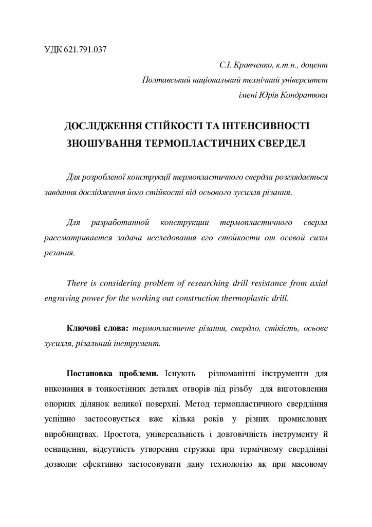 Для розробленої конструкції термопластичного свердла розглядається завдання дослідження його стій...