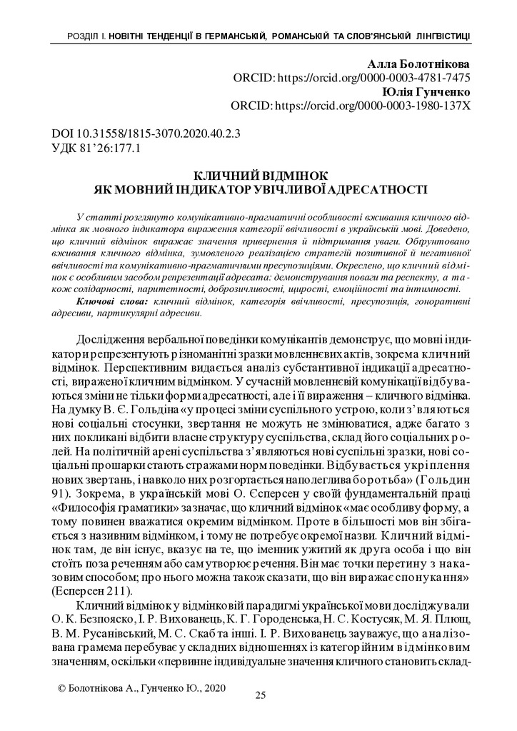 Кличний відмінок як мовний індикатор увічливої адресатності