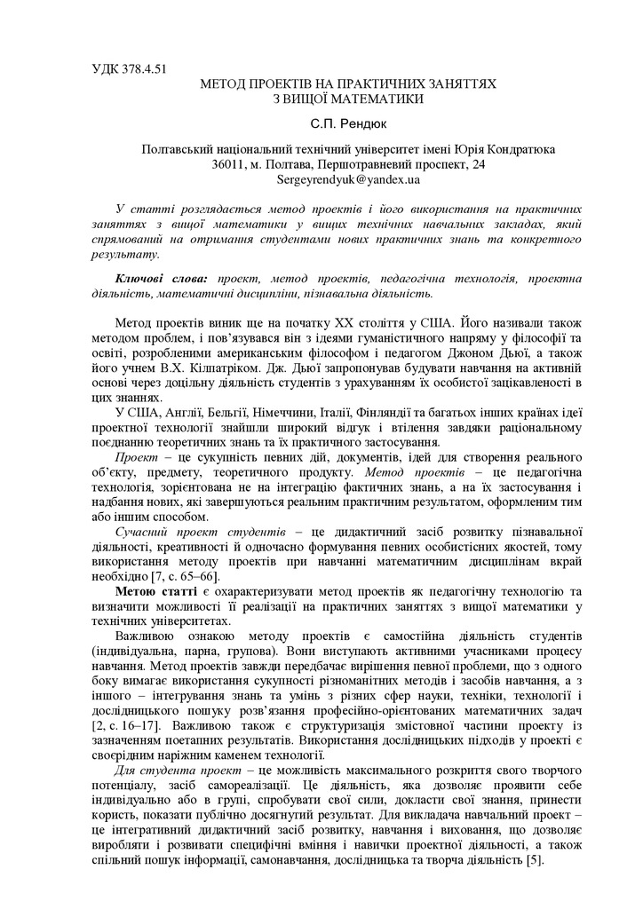 Метод проектів на практичних заняттях з вищої математики