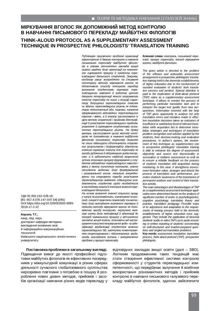 Міркування вголос як допоміжний метод контролю в навчанні письмового перекладу майбутніх філологів