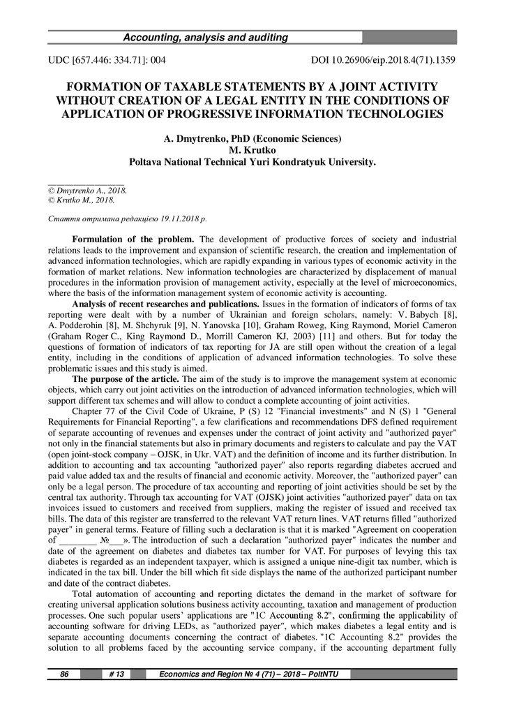 Стаття 2020/06/03Formation of taxable statements by a joint activity without creation of a legal entity in the conditions of application of progressive information technologies