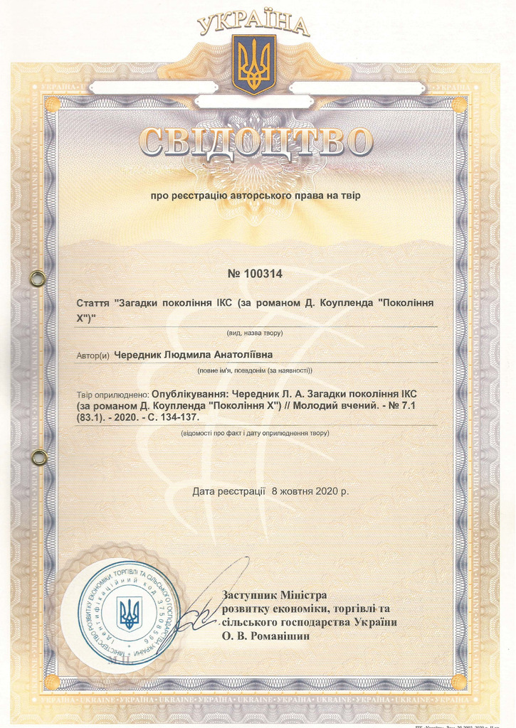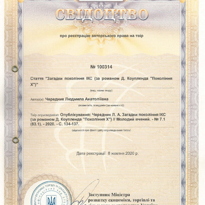 Свідоцтво про реєстрацію авторського права № 100314 Україна на твір «Загадки покоління ІКС (за романом Д. Коупленда «Покоління Х»)"