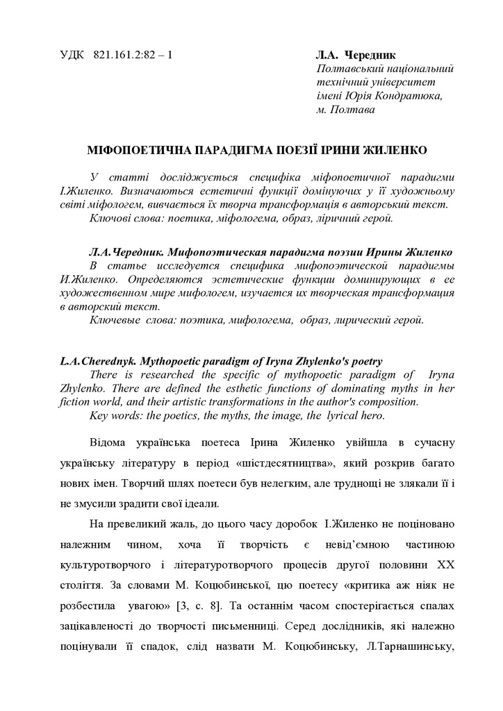 Стаття 2020/09/09Міфопоетична парадигма поезії Ірини Жиленко