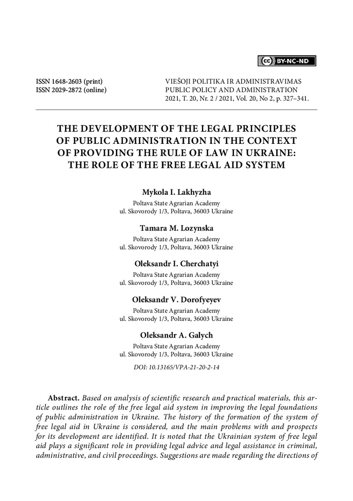 The develorment of the legal principles of public administration in the context of providing the rule of law in Ukraine: the rolle of the free legal aid system