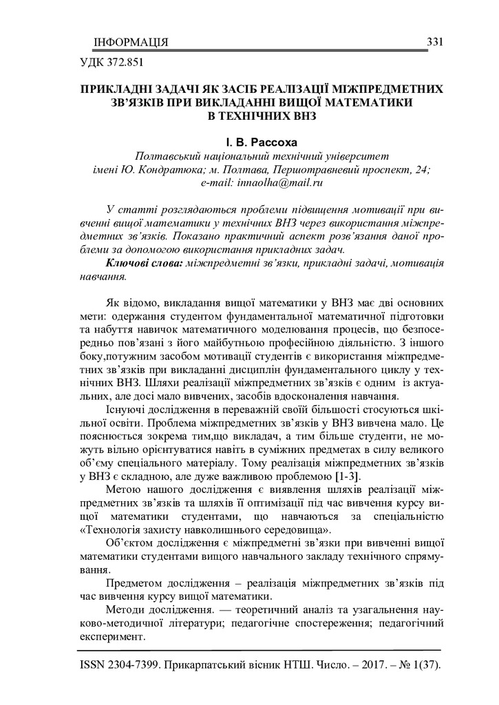 2018/10/29Прикладні задачі як засіб реалізації міжпредметних зв’язків при викладанні вищої математики в технічних ВНЗ