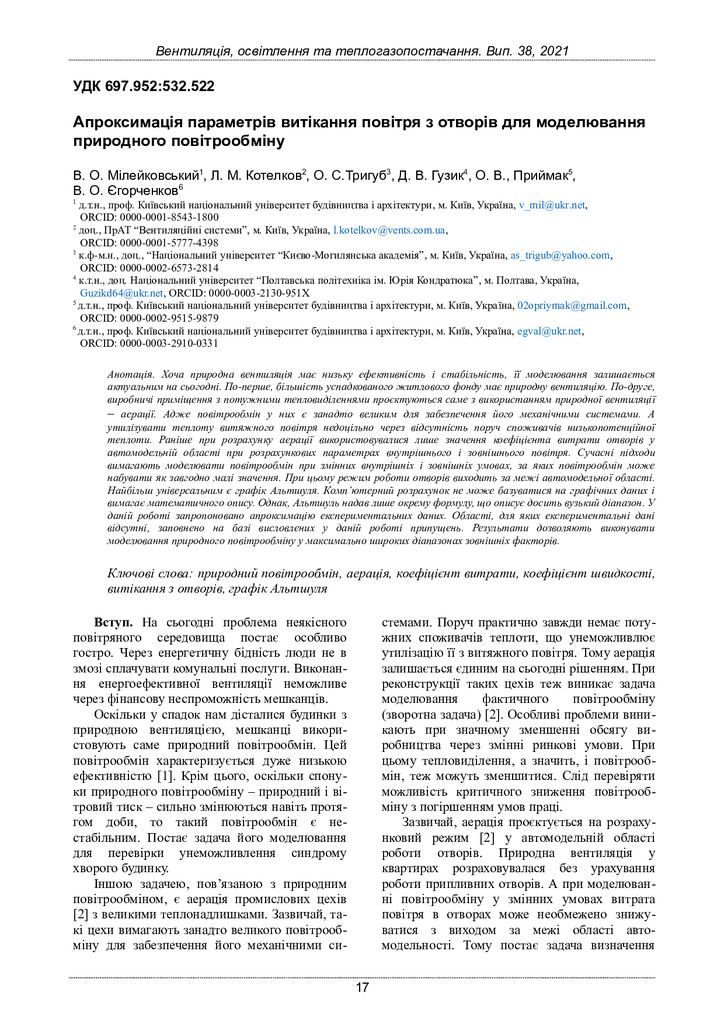 Апроксимація параметрів витікання повітря з отворів для моделювання природного повітрообміну